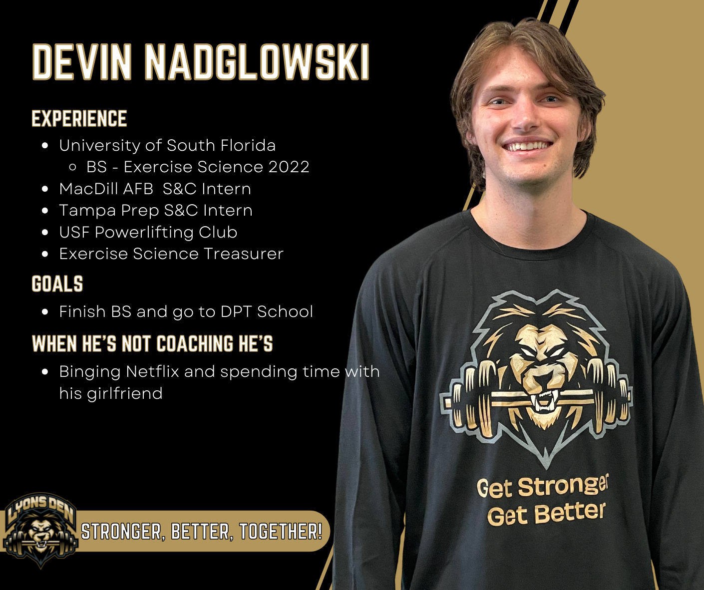 Devin comes to us from The University of South Florida’s Exercise Science program and will be with us through April.